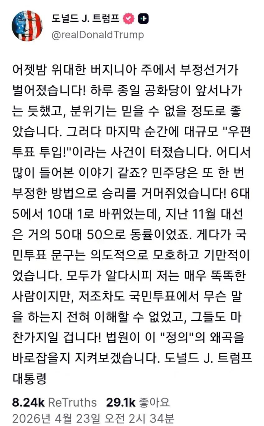 버지니아 선거로 멘탈 날라간 트럼프 ㅋㅋ