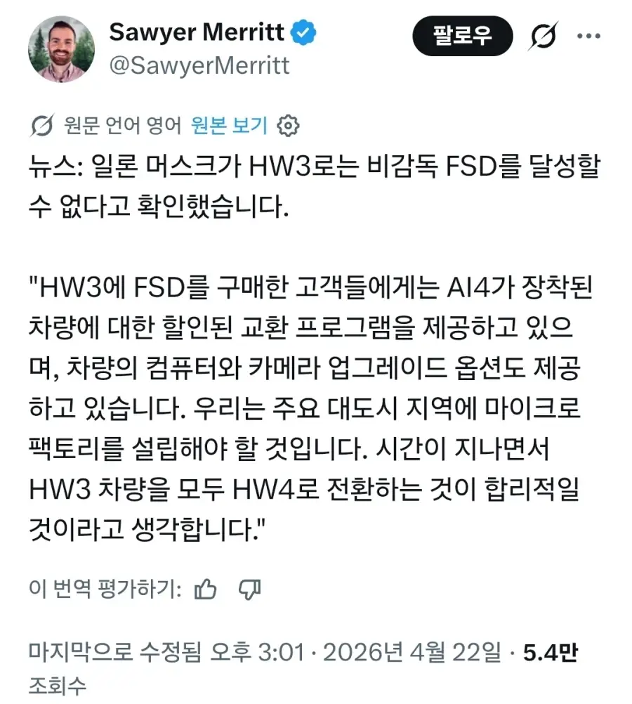일론 머스크, HW3 비감독 FSD 불가능 선언