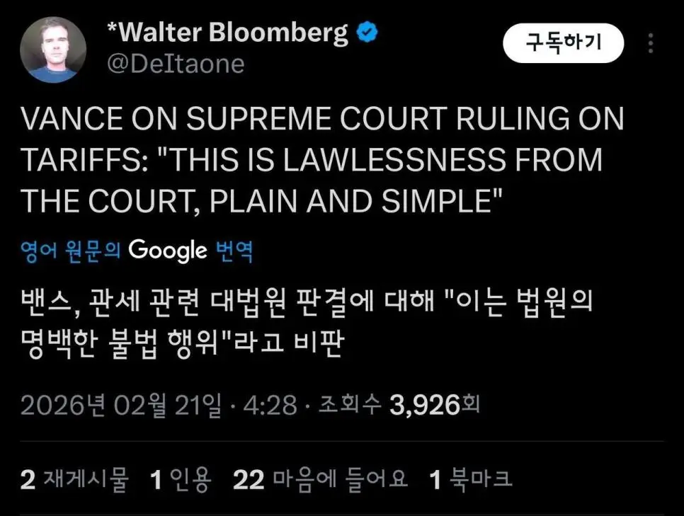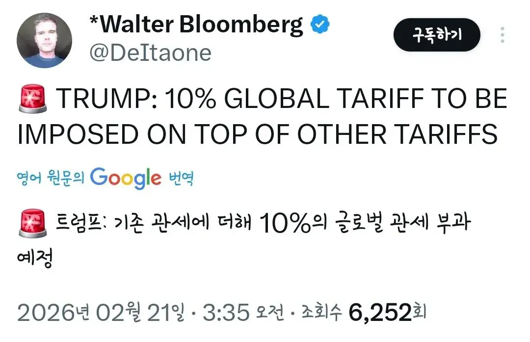 속보) 트럼프, 122조 법안에 따라 전세계 10% 과세 추가부과 예정
