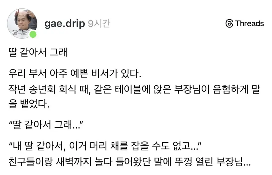 회식때 예쁜비서에게 딸 같아서 그래 라고 하는 부장님