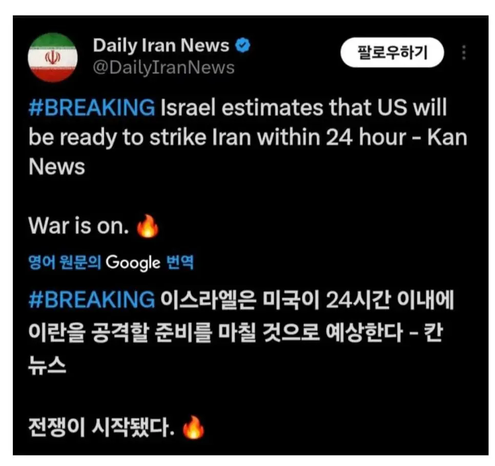[속보] 이스라엘 "미국 이란 공격 24시간안에 일어날것"