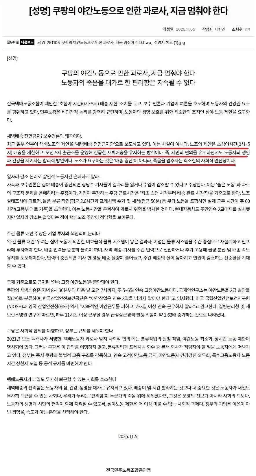 민주노총 "우리는 쿠팡 새벽배송 전면금지를 주장한적이 없다"