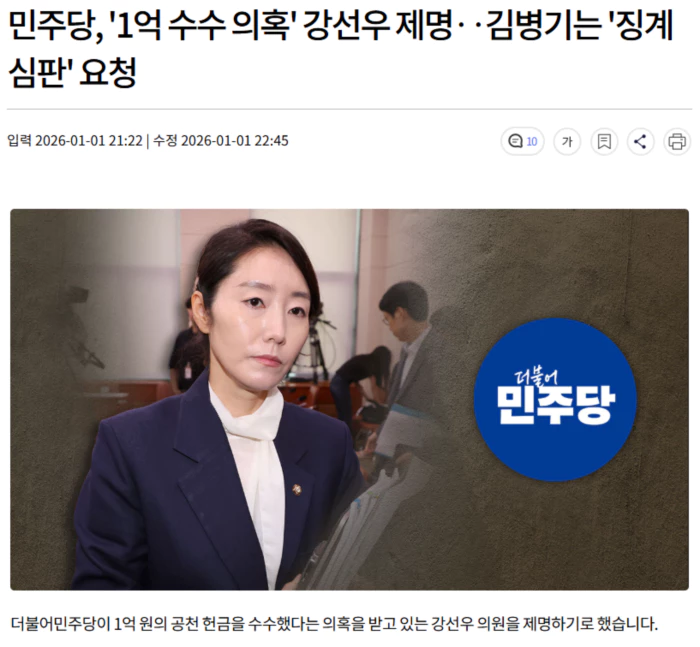 민주당, '1억 수수 의혹' 강선우 제명.. 김병기는 '징계 심판' 요청