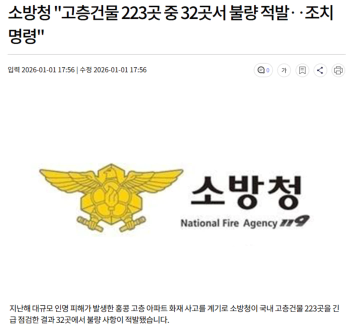 소방청 "고층건물 223곳 중 32곳서 불량 적발.. 조치 명령"