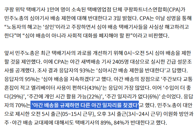 민주노총 "우리는 쿠팡 새벽배송 전면금지를 주장한적이 없다"