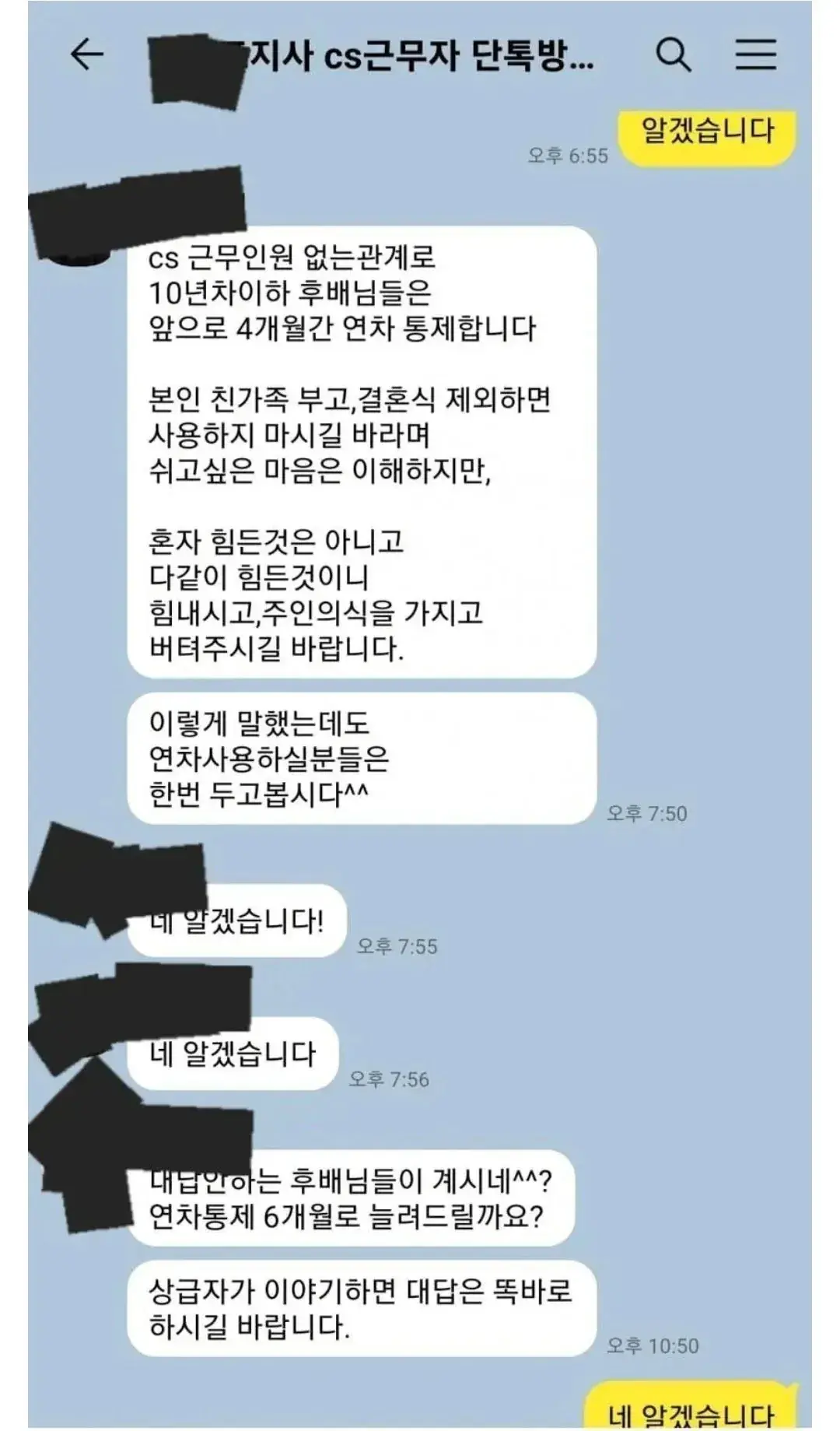 10년차 이하 후배님들은 앞으로 4 개월간 연차 통제합니다.