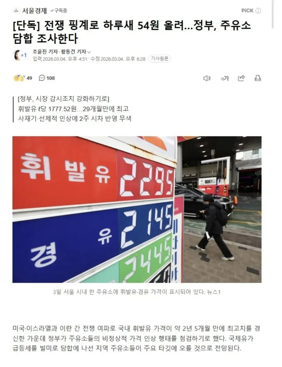 [단독] 전쟁 핑계로 하루새 54원 올려…정부, 주유소 담합 조사한다