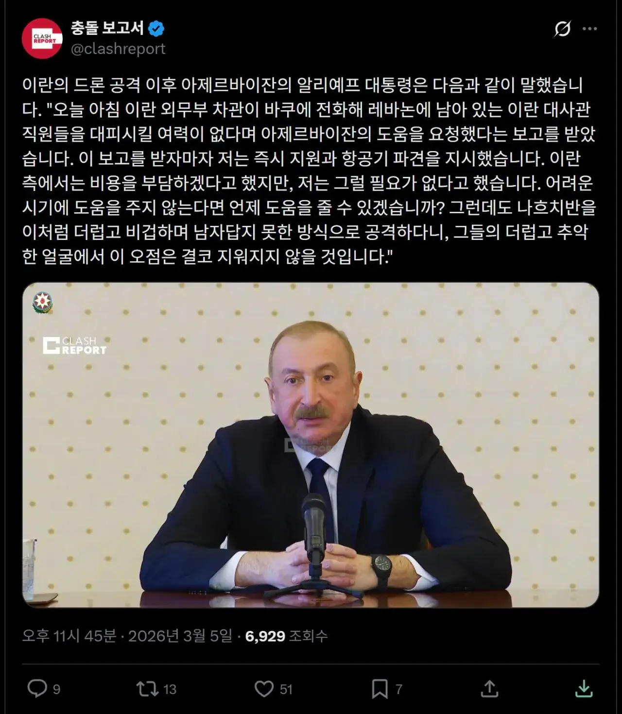 어제 뜬금 미사일처맞은 아제르바이잔 대통령 근황