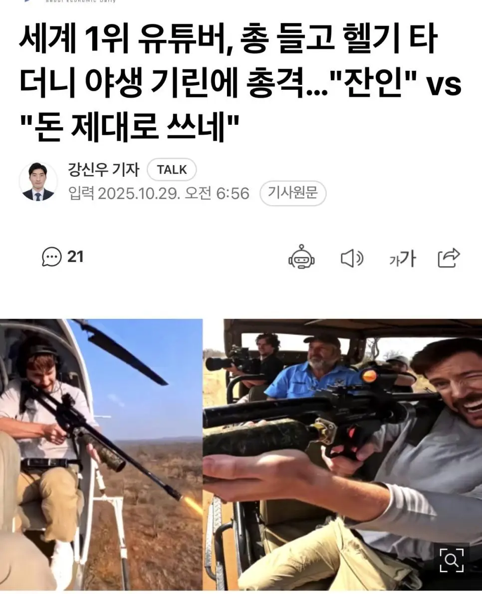 세계 1위 유튜버 수백마리 야생기린한테 총 쏴서 논란
