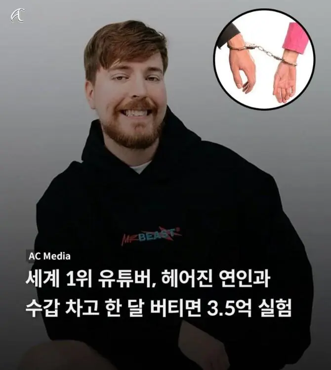 미스터비스트, 헤어진 연인과 수갑차고 한달 버티면 3.5억