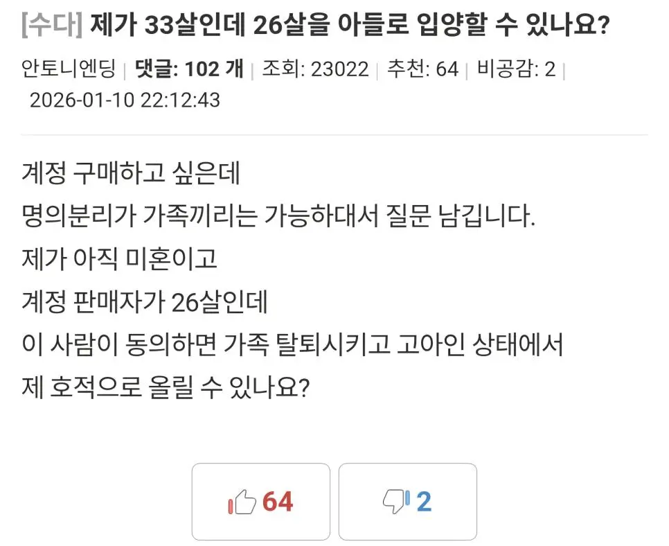 제가 33살인데 26살을 아들로 입양할 수 있나요??