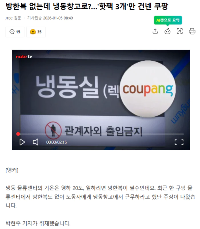 방한복 없는데 냉동창고로?.. '핫팩 3개'만 건넨 쿠팡