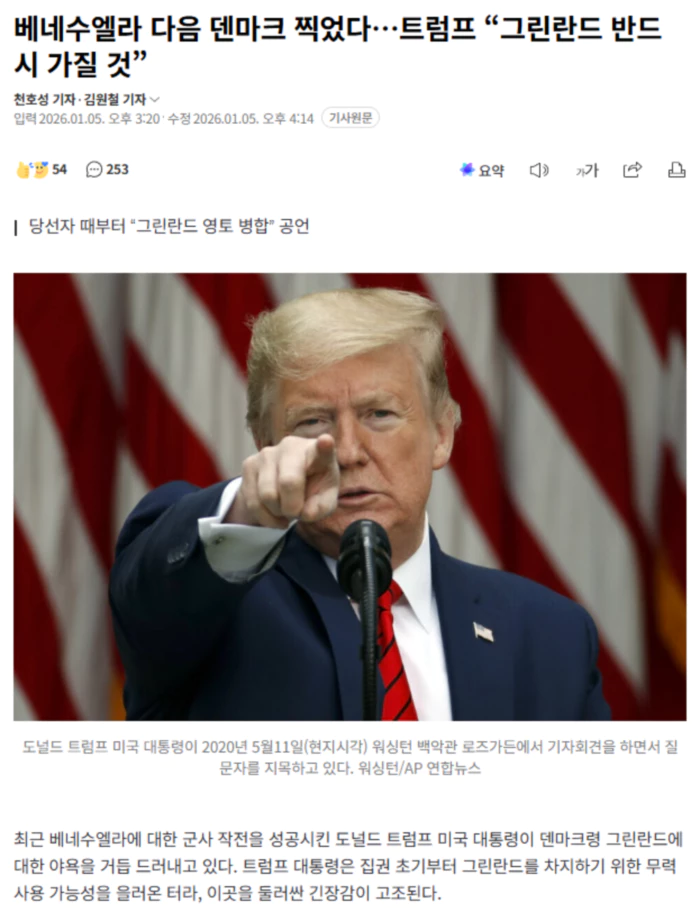 베네수엘라 다음 덴마크 찍었다.. 트럼프 “그린란드 반드시 가질 것”