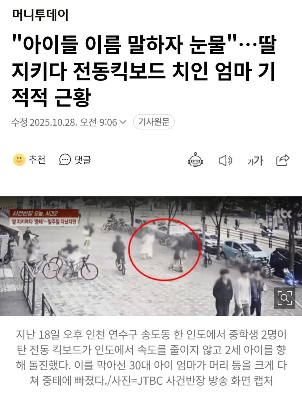 킥보드 사고당한 2살 아이 어머니 기적적으로 눈뜨셨다고 함