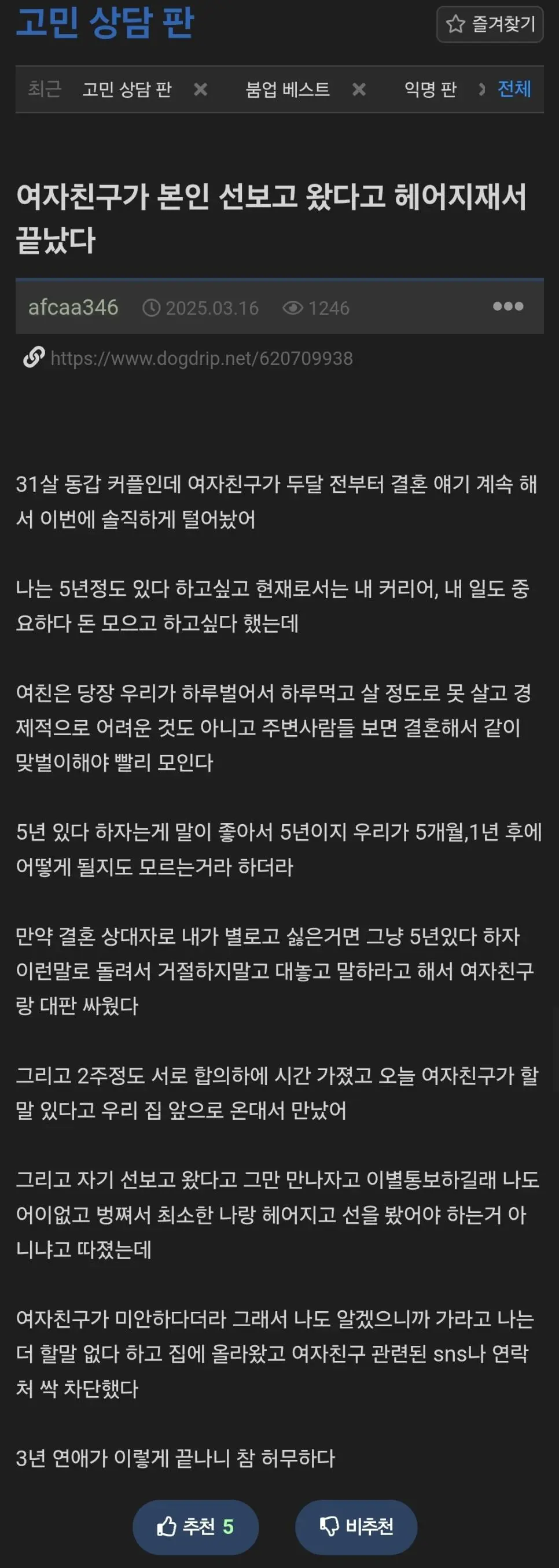 여자친구가 본인 선보고 왔다고 헤어지자고 해서 끝났다.