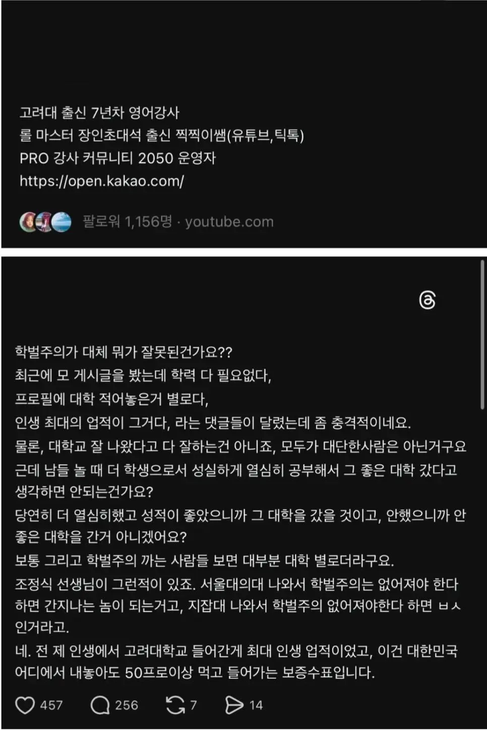 스레드에서 핫한 고대 출신 학원강사의 학벌주의