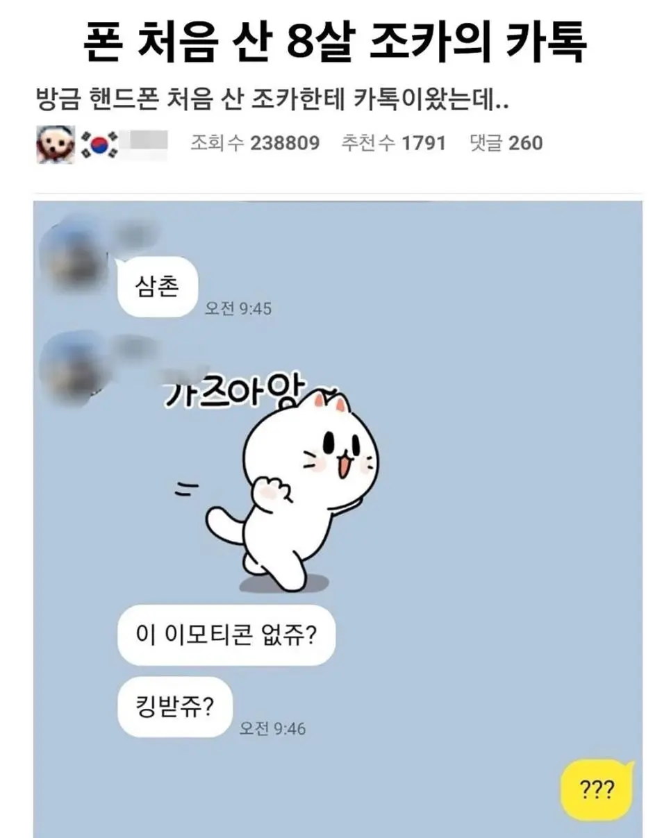 첫 스마트폰이 생긴 8살 조카와 카톡.