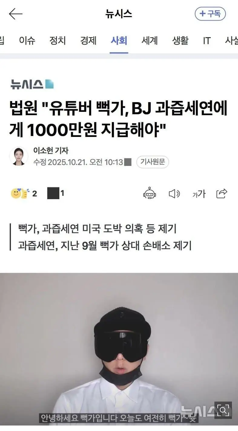 법원 "뻑가, 과즙세연에게 1000만원 지급해야"