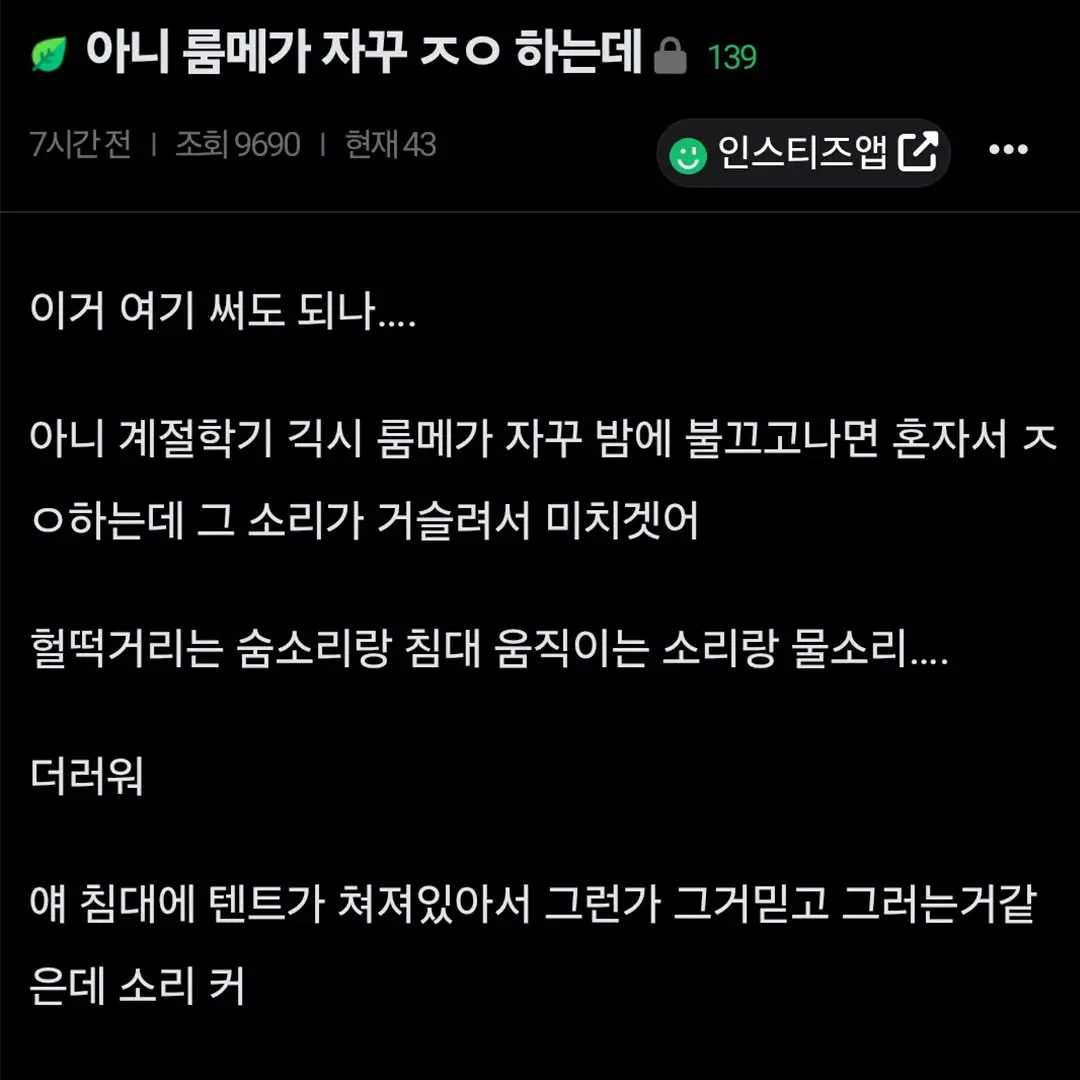 룸메가 밤에 자려는데 자꾸 뀨뀨해서 못자겠어..