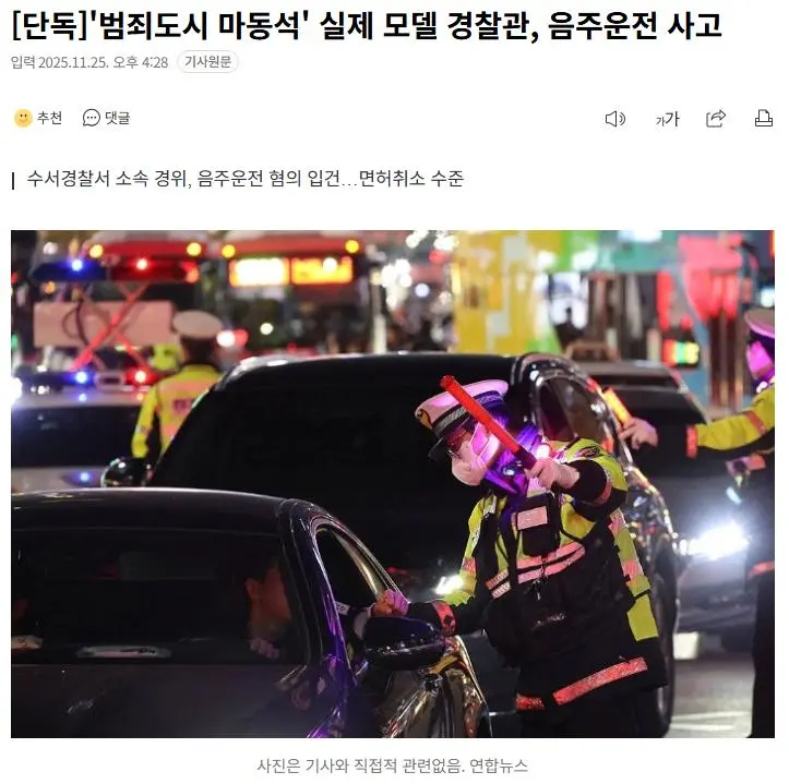 '범죄도시 마동석' 실제 모델 경찰관, 음주운전 사고