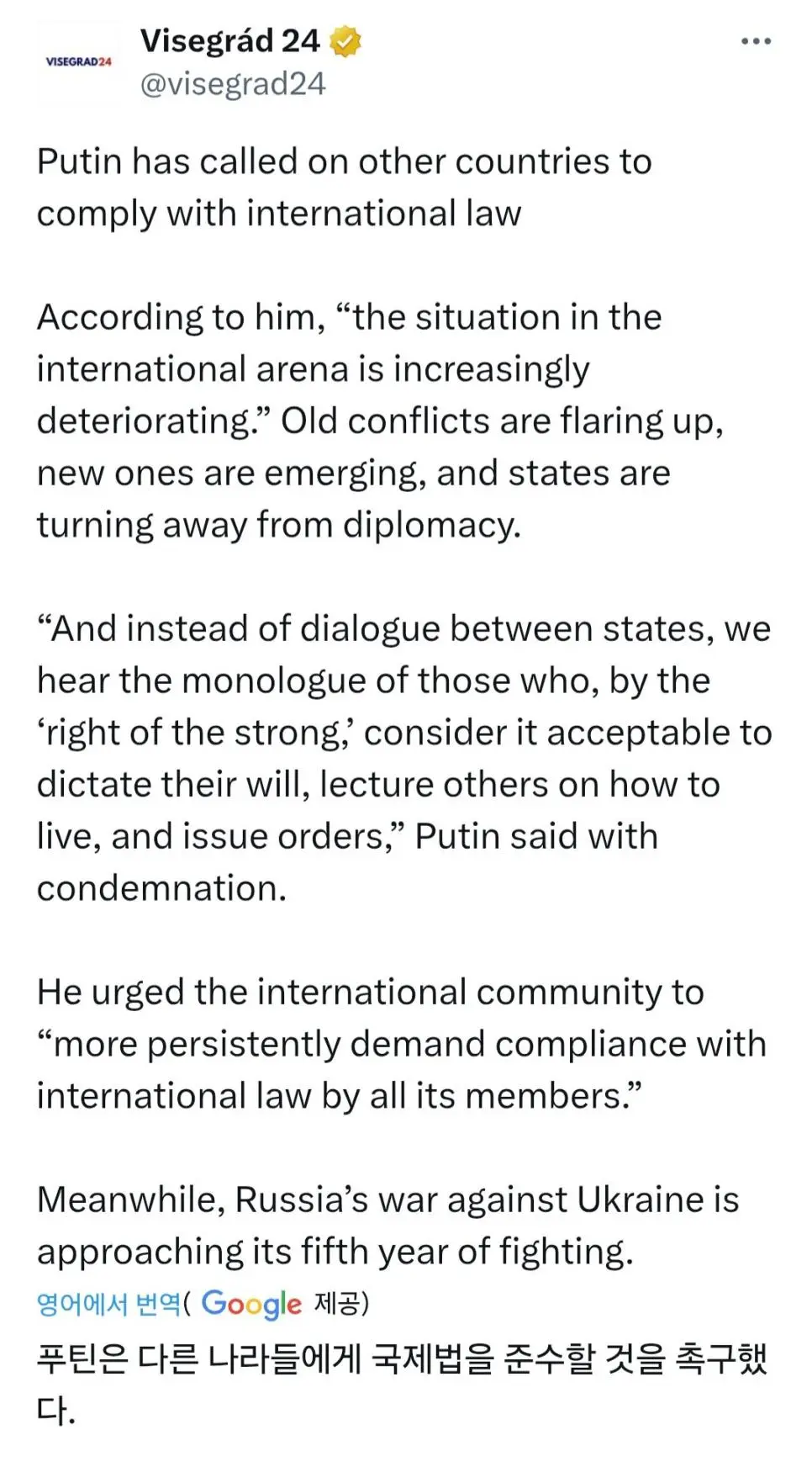 푸틴, "국제법 준수하자... 국제 사회가 약육강식으로 굴러가서는 안 된다"