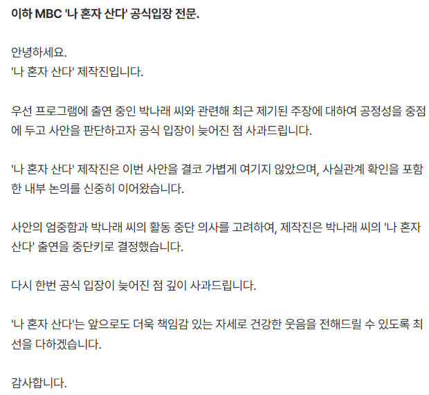 방송) 박나래 나혼자 산다 출연 중단