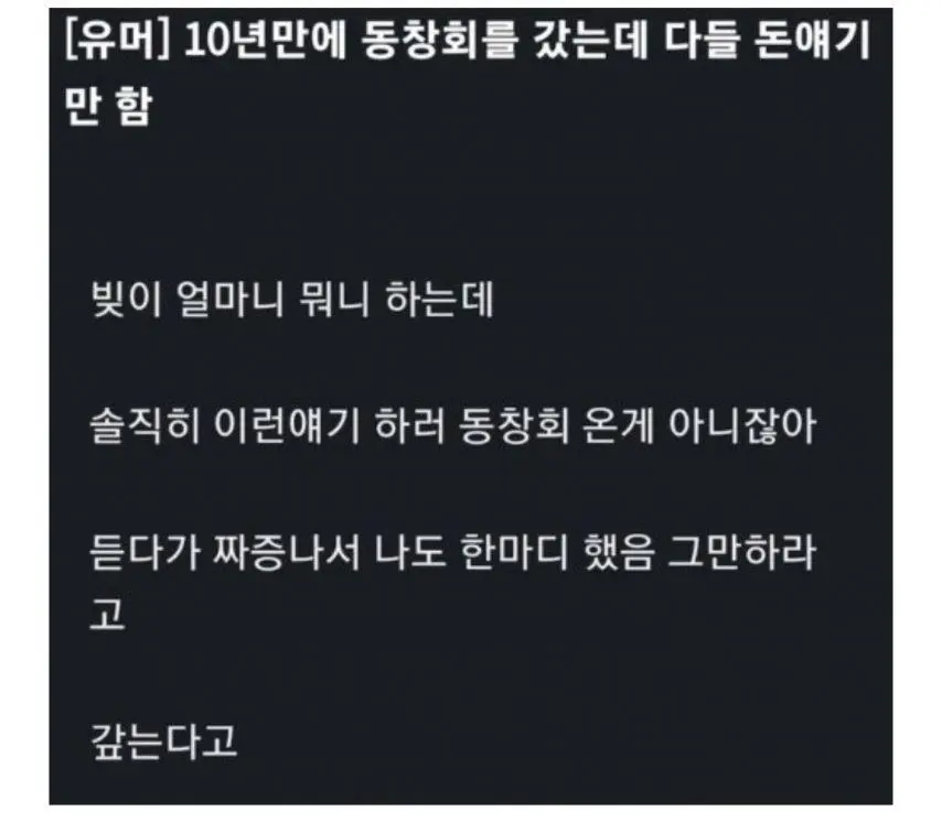 10년만에 동창회를 갔는데 다들 돈 얘기만 함