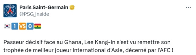 PSG는 전날에도 축하 메시지를 띄우는 데 전념했다. 구단 누리소통망(SNS)을 통해 이강인의 수상 소식을 조명했다.