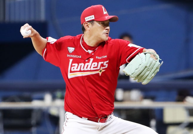 SSG 노경은이 30일 서울 고척스카이돔에서 열린 2025 KBO리그 키움전에서 구원 등판해 힘차게 공을 던지고 있다. 사진 | SSG 랜더스 |