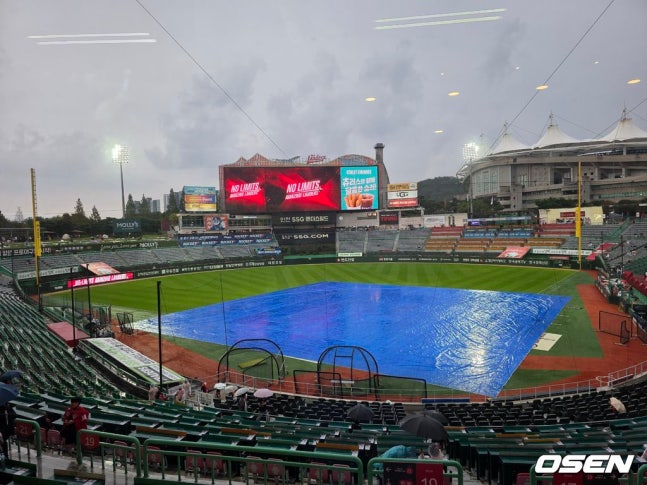 그런데 예상하지 못한 변수가 발생했다. 오후 5시경부터 갑작스럽게 비가 내리기 시작한 것이다. SSG랜더스필드 구장 관리팀은 빠르게 그라운드에 방수포를 설치했지만 비가 그치지 않는다면 지연개시 가능성도 있다.