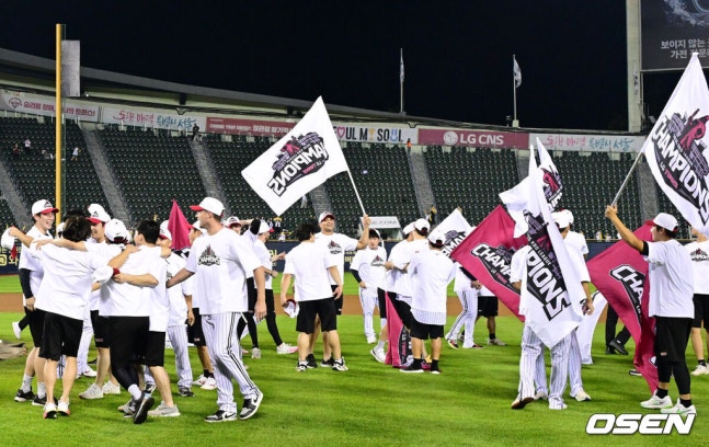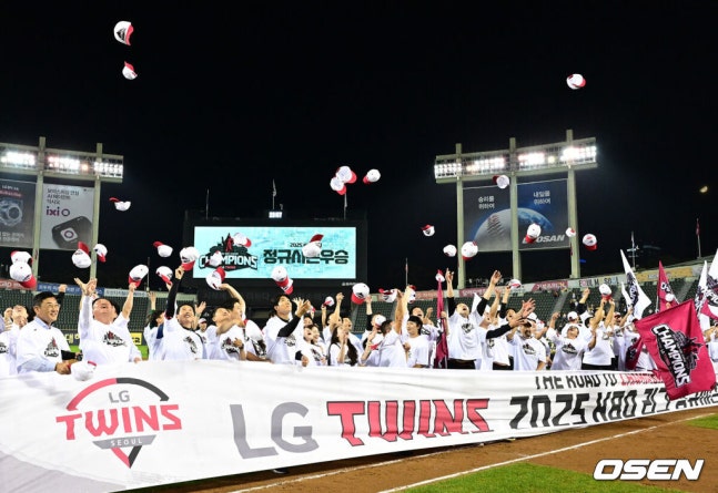[OSEN=잠실, 지형준 기자] 프로야구 LG 트윈스가 극적으로 2025 정규시즌 우승을 차지했다. 자력 우승이 물거품이 된 LG는 SSG 랜더스가 한화 이글스에 극적인 끝내기 승리를 거두면서 우승을 확정했다. LG는 1일 서울 잠실구장에서 열린 2025 KBO리그 NC와 시즌 마지막 경기에서 3-7로 패배했다. 이로써 LG는 85승 3무 56패로 시즌을 마쳤다. LG 선수단이 우승 세리머니를 하고 있다.