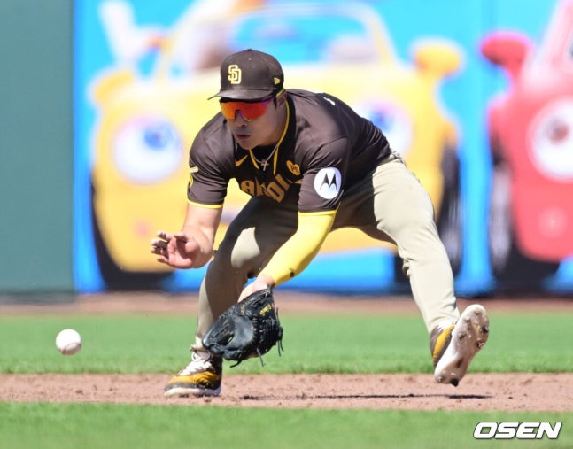 [OSEN=오라클 파크(샌프란시스코 미국 캘리포니아주), 지형준 기자] 샌프란시스코는 8일(한국시간) 미국 캘리포니아주 샌프란시스코 오라클 파크에서 열린 2024시즌 메이저리그 샌디에이고와의 경기에서 3-2로 승리했다. 8회말 2사 1루에서 샌디에이고 김하성이 땅볼을 처리하고 있다. 2024.04.08