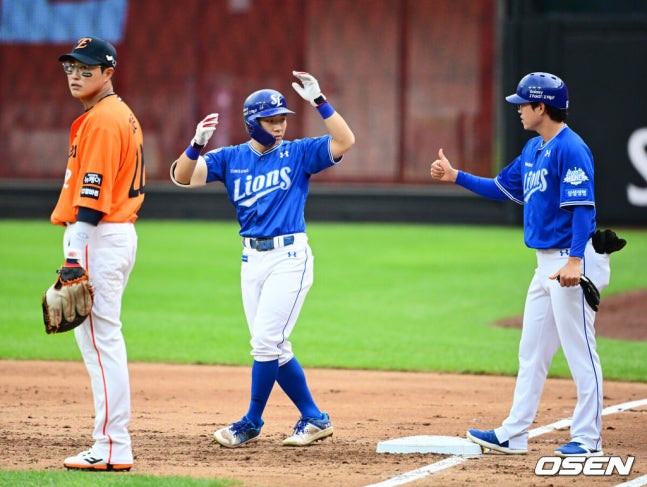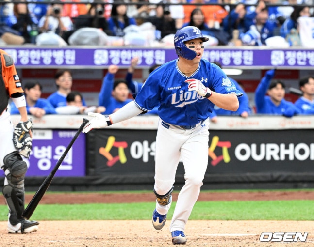 [OSEN=대전, 지형준 기자] 19일 오후 대전 한화생명볼파크에서 2025 신한 SOL Bank KBO리그 포스트시즌 플레이오프 2차전 한화 이글스와 삼성 라이온즈의 경기가 열렸다.한화는 라이언 와이스, 삼성은 최원태를 선발 투수로 내세웠다.3회초 무사 1루에서 삼성 김지찬이 중전 안타를 날리며 기뻐하고 있다. 2025.10.19 /[email protected]