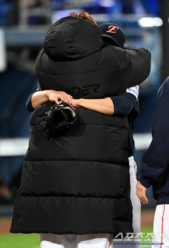 류현진의 품에 안긴 문동주, 얼굴이 보이지 않을 정도로 깊은 포옹을