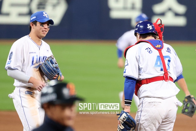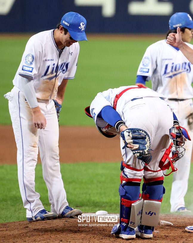 [스포티비뉴스=대구, 곽혜미 기자] 18살 차 대선배가 먼저 허리를 숙였다. 삼성 베테랑 포수 강민호가 결정적 홈런을 터뜨린 김영웅에게 90도 인사를 했다.