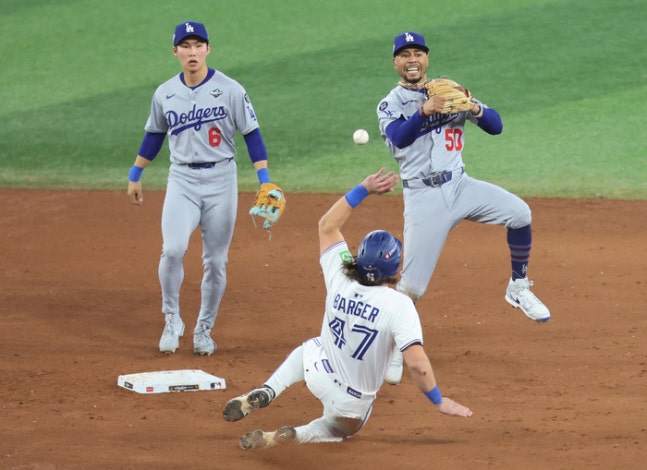 | 11회말 대수비로 월드시리즈 무대를 밟은 LA 다저스 김혜성(왼쪽)이 2일(한국시간) 로저스센터에서 열린 7차전에서 우승 확정 순간을 만드는 무키 베츠(오른쪽)의 1루 송구를 지켜보고 있다. 사진 | UPI 연합뉴스 |
