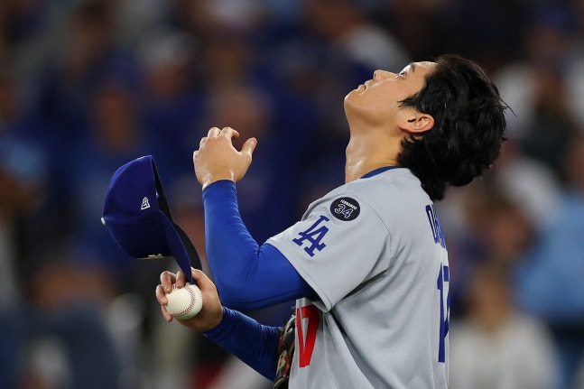 오타니는 2일 캐나다 토론토의 로저스센터에서 열린 2025 메이저리그(MLB) 월드시리즈(WS·7전4선승) 7차전에서 2.1이닝 5피안타 2볼넷 3실점을 기록하고 마운드를 내려왔다. 삼진은 3개였고, 최고 구속은 100.9마일(약 162.4㎞)이 찍혔다.