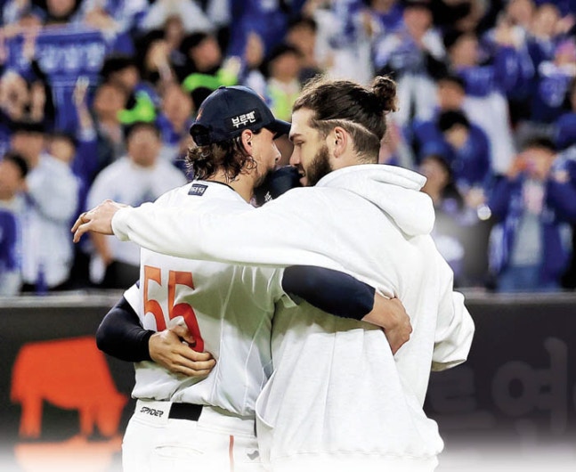 한화 외국인 원투펀치 코디 폰세(오른쪽)와 라이언 와이스(왼쪽)가 지난 10월 24일 플레이오프 5차전에서 삼성을 꺾고 한국시리즈 진출을 확정한 뒤 기뻐하고 있다. 연합뉴스
