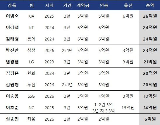현재 KBO리그 10개 구단 감독들 중 최고액 몸값은 KIA 이범호 감독이다. 이 감독은 지난해 KIA를 우승으로 이끈 뒤 3년간 총액 26억원의 특급 대우를 보장받았다. 다만 옵션으로 6억원(연간 2억원)이 걸려있어 보장 금액만 놓고 본다면 KT 이강철, 롯데 김태형 감독의 3년간 24억원이 최고다. 두 감독은 성적에 따른 인센티브 조항이 걸려있지 않다.