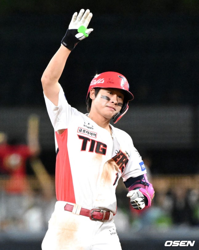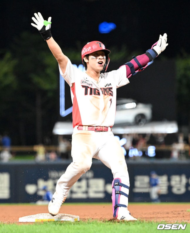 [OSEN=광주, 이대선 기자] 10일 오후 광주-기아 챔피언스필드에서 2025 신한 SOL Bank KBO리그 KIA 타이거즈와 삼성 라이온즈의 경기가 열렸다.KIA는 네일, 삼성은 가라비토를 선발 투수로 내세웠다.8회말 무사 1,3루에서 KIA 박찬호가 우중간 2타점 적시 3루타를 치고 환호하고 있다. 2025.09.10 /[email protected]