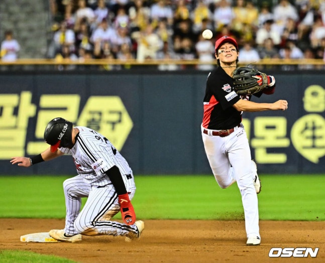 [OSEN=잠실, 지형준 기자] 13일 오후 서울 잠실구장에서 ‘2025 신한 SOL Bank KBO리그’ LG 트윈스와 KIA 타이거즈의 경기가 열렸다.LG는 임찬규, KIA는 이의리가 선발로 나섰다. 6회말 무사 1루에서 KIA 박찬호가 LG 문보경의 2루땅볼에 오스틴을 포스아웃 처리하고 1루로 송구하며 병살을 완성하고 있다. 2025.09.13 /[email protected]