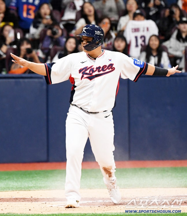 2025 K-BASEBALL SERIES 대한민국과 체코의 평가전이 8일 고척스카이돔에서 열렸다. 2회말 1사 3루 최재훈 희생타 때 3루 주자 한동희가 태그업 후 홈을 파고들고 있다. 고척=박재만 기자 [email protected]/2025.11.08/