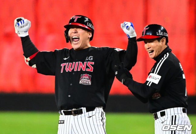 [OSEN=대전, 지형준 기자] 30일 대전 한화생명볼파크에서 2025 신한 SOL Bank KBO리그 포스트시즌 한국시리즈 4차전 한화 이글스와 LG 트윈스의 경기가 열렸다.이날 경기에 한화는 와이스를, LG는 치리노스를 선발투수로 내세웠다. 9회초 2사 2,3루에서 LG 김현수가 역전 2타점 우전 적시타를 날리며 기뻐하고 있다. 2025.10.30 / [email protected]