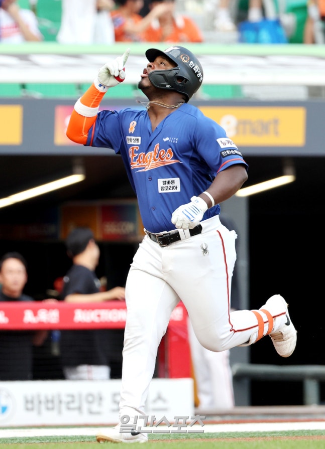 2024 KBO리그 프로야구 SSG 랜더스와 한화 이글스의 경기가 18일 오후 인천SSG랜더스필드에서 열렸다. 3회초 무사 페라자가 우월 솔로홈런을 치고 홈인하며 세리머니를 하고 있다. 인천=김민규 기자/2024.08.18/