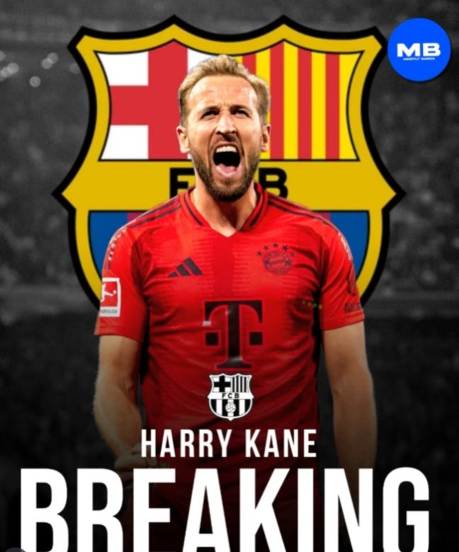 그러면서 바르셀로나 타깃이 달라졌다. 케인이 언급되고 있다. 케인은 토트넘 공식전 435경기에 나와 280골 63도움을 기록했다. 프리미어리그에서만 213골을 터트리면서 앨런 시어러에 이어 역대 최다득점 2위에 올라있다. 케인은 2023년에 이어 토트넘을 떠나 뮌헨으로 갔다. 트로피 획득을 위해 뮌헨으로 갔는데 첫 시즌에는 우승에 실패했다. 독일 분데스리가 32경기 36골로 역사를 썼고 유럽축구연맹(UEFA) 챔피언스리그(UCL) 12경기 8골을 기록했는데 분데스리가 우승에 실패했고 다른 대회에서도 무관에 그쳤다.