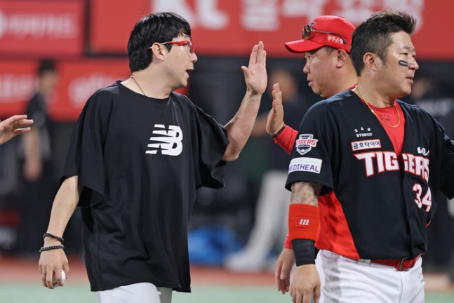 | 이범호 감독(오른쪽)이 양현종(왼쪽)과 경기 후 하이파이브를 하고 있다. 사진 | KIA 타이거즈 |
