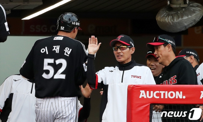 하이파이브 하는 이재원(왼쪽)과 염경엽 LG 트윈스 감독. 뉴스1 DB ⓒ News1 박지혜 기자