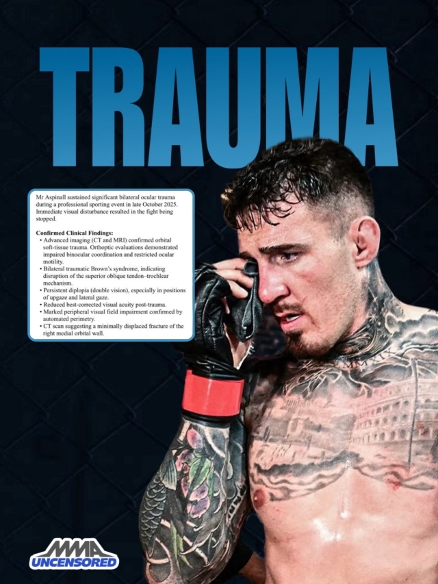 ‘MMA 파이팅’은 “아스피날이 공개한 의료 자료에 의하면 그는 브라운 증후군과 일치하는 소견을 보이고 있다. 브라운 증후군은 눈의 움직임을 조절하는 근육, 힘줄에 문제가 생기는 질환으로 알려져 있다”고 설명했다. 결국 아스피날은 이 부분에 문제가 있어 옥타곤 복귀를 하지 못하고 있는 상황이다. 결국 의학적 허가를 받아야만 간과의 리매치도 가능하다. 사진=MMA UNCENSORED SNS