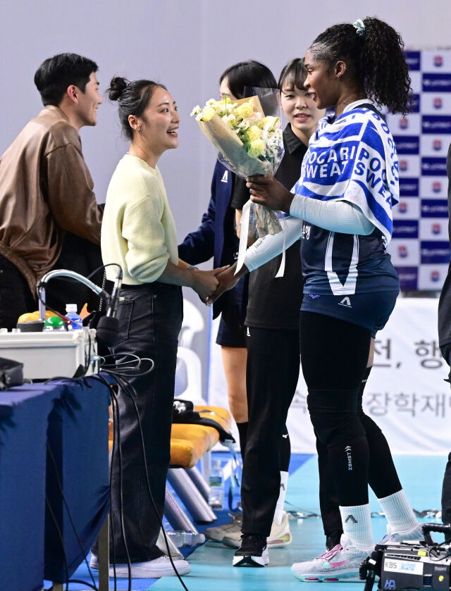 한국도로공사 모마가 깜짝 방문한 최윤지 통역의 꽃다발 선물에 기뻐하고 있다 / 한국배구연맹(KOVO)