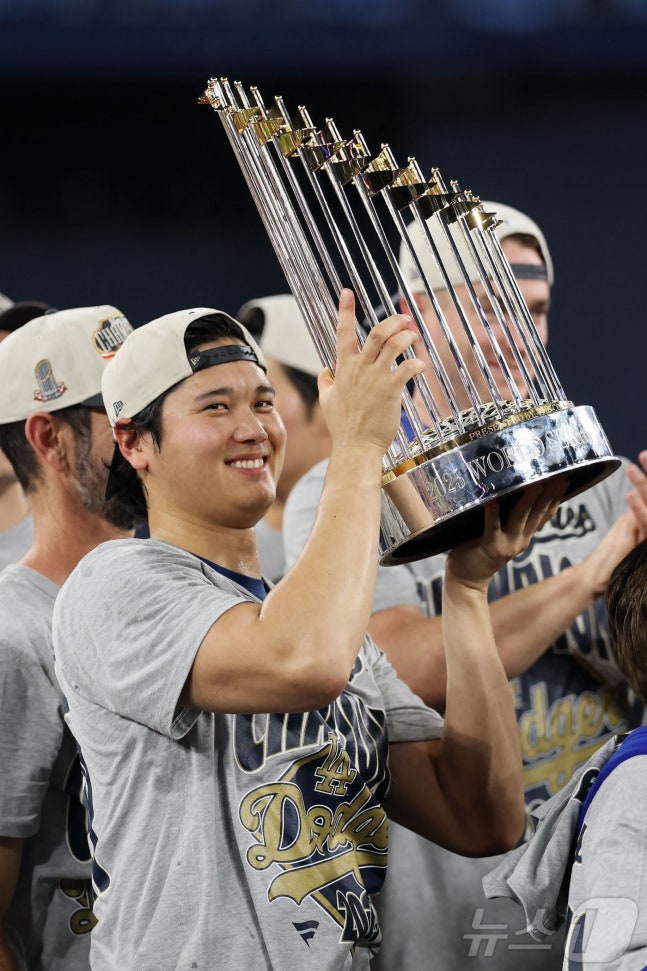 월드시리즈 우승 트로피를 든 오타니 쇼헤이. ⓒ AFP=뉴스1